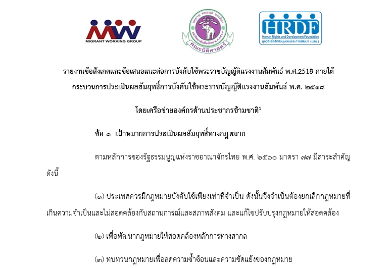 เครือข่ายองค์กรแรงงานด้านประชากรข้ามชาติ คณะนิติศาสตร์ มหาวิทยาลัยเชียงใหม่และมูลนิธิเพื่อสิทธิมนุษยชนและการพัฒนา ส่งรายงานข้อสังเกตและข้อเสนอแนะต่อการบังคับใช้พระราชบัญญัติแรงงานสัมพันธ์ พ.ศ.2518 ภายใต้กระบวนการประเมินผลสัมฤทธิ์การบังคับใช้พระราชบัญญัติแรงงานสัมพันธ์ พ.ศ. ๒๕๑๘