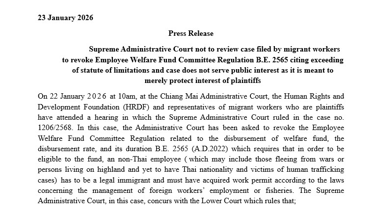 Press Release: Supreme Administrative Court not to review case filed by migrant workers to revoke Employee Welfare Fund Committee Regulation B.E. 2565 citing exceeding of statute of limitations and case does not serve public interest as it is meant to merely protect interest of plaintiffs
