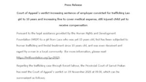 As legal representatives in this case, HRDF deems it fit that the Ministry of Labour should review and revise the policy on the management of foreign workers which has caused the migrant workers who have registered legally to become undocumented workers. The underlying problems are down to the highly complicated registration process which force both the employers and the employees to rely on services from brokers. And that has led to mistakes in the work-related documentation, problems during the change of employers, or the document retention problem, all of which have caused the workers to become undocumented and not receive justice. State protection mechanisms often invoke the workers’ legal status as a reason to deny them access to the rights prescribed by labour protection law, which is concerned with public order and good morals and human dignity and are upheld in the Constitution of the Kingdom of Thailand and the international conventions to which Thailand is a state party. By doing so, it shall not promote the atmosphere inducive to respect of human rights among businesses, even though the Thai government is being engaged in the drafting of the law to human rights due diligence B.E……. (draft HRDD Act).