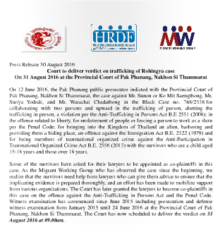 Press Release : Court to deliver verdict on trafficking of Rohingya case On 31 August 2016 at the Provincial Court of Pak Phanang, Nakhon Si Thammarat