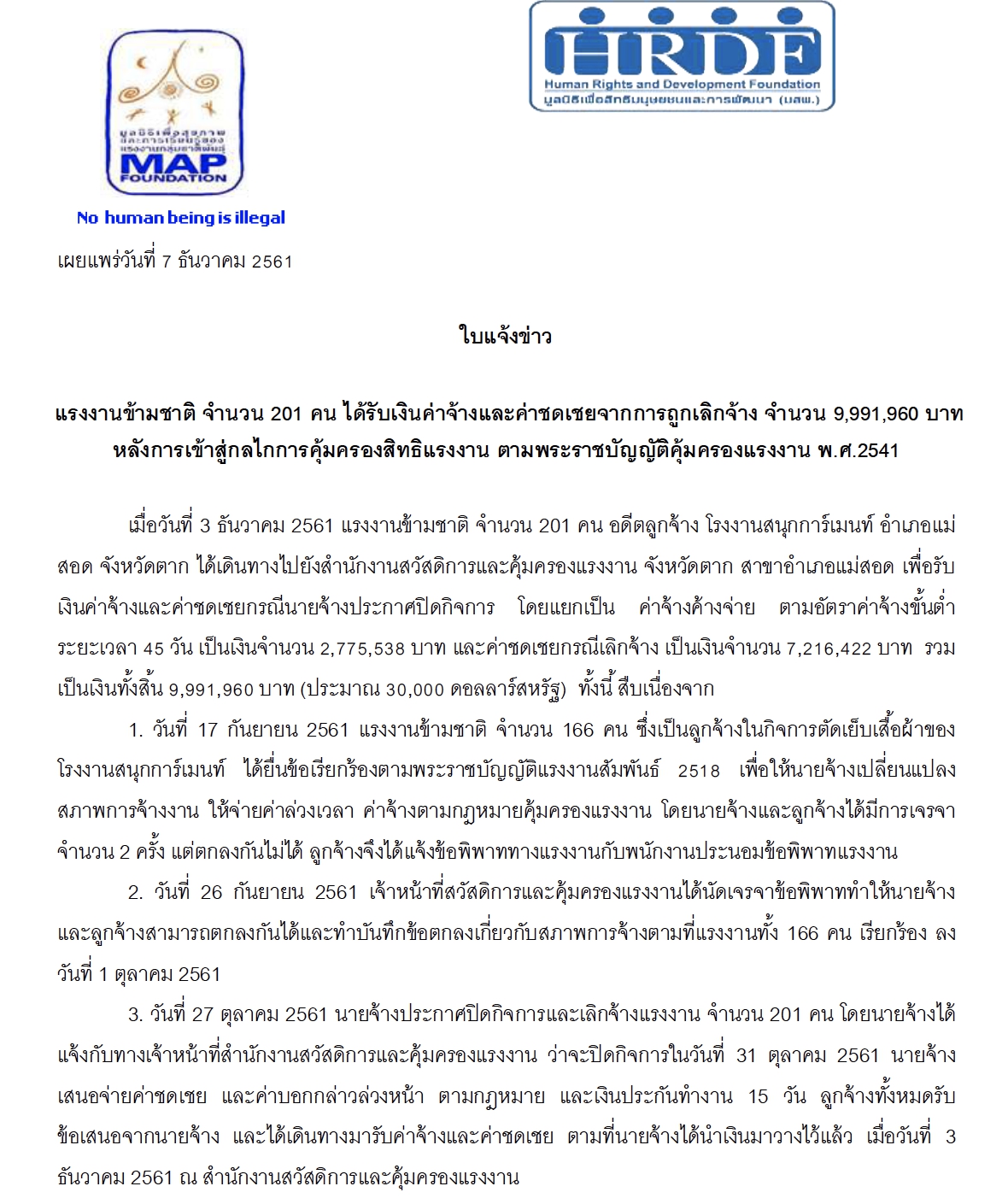 ใบแจ้งข่าว: แรงงานข้ามชาติ จานวน 201 คน ได้รับเงินค่าจ้างและค่าชดเชยจากการถูกเลิกจ้าง จานวน 9,991,960 บาท หลังการเข้าสู่กลไกการคุ้มครองสิทธิแรงงาน ตามพระราชบัญญัติคุ้มครองแรงงาน พ.ศ.2541