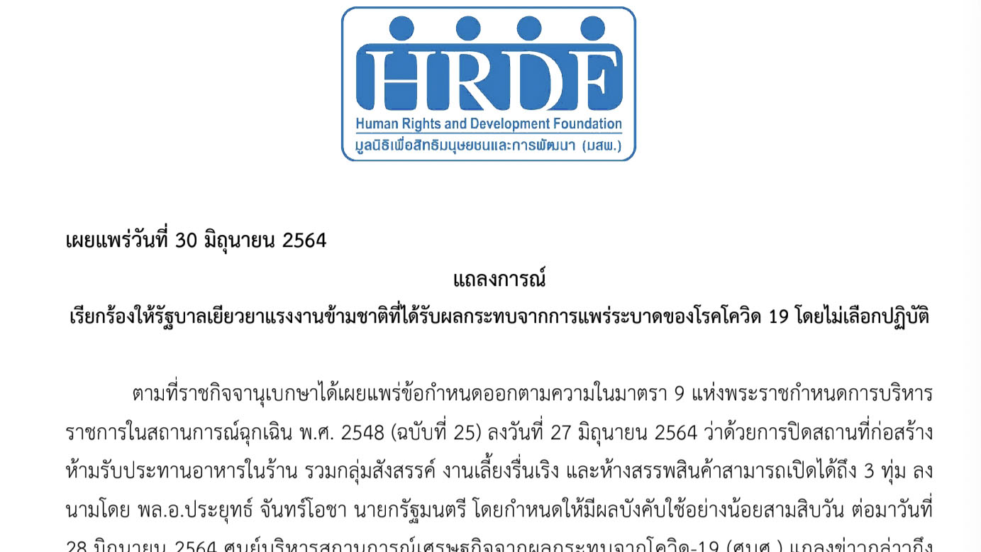 มูลนิธิเพื่อสิทธิมนุษยชนและการพัฒนา (มสพ.) เห็นว่า เป็นระยะเวลาเกือบสองปีแล้วที่รัฐบาลได้เพิกเฉยต่อการจัดการดูแลแรงงานข้ามชาติ แม้จะทราบดีว่าแรงงานข้ามชาติมีความเสี่ยงที่จะเกิดการแพร่ระบาดได้ง่ายจากสภาพความเป็นอยู่อย่างแออัด ผลกระทบที่เกิดขึ้นในช่วงสถานการณ์การแพร่ระบาดของโรคโควิด 19 ครั้งใหญ่ครั้งนี้ไม่เพียงแต่กระทบต่อแรงงานก่อสร้างหรือร้านอาหาร ตามข้อกำหนดฉบับที่ 25 เท่านั้น แต่ส่งผลต่อแรงงานทุกประเภทในทุกพื้นที่ ปัจจุบันกรมควบคุมโรค ระบุตัวเลข ณ วันที่ 24 มิถุนายน 2564 มีแรงงานข้ามชาติที่ได้รับเชื้อโควิด 19 จำนวน 48,135 คน โดยที่ไม่ได้รับการรักษาอย่างเหมาะสม และยังมีแรงงานข้ามชาติจำนวนมากพ้นจากสถานะลูกจ้างเนื่องจากตกงานจากสภาพเศรษฐกิจที่ตกต่ำ ในขณะเดียวกันมาตรการเยียวยาของรัฐบาลตั้งแต่อดีตจนถึงปัจจุบันแสดงให้เห็นได้อย่างชัดเจนถึงทัศนคติการเลือกปฏิบัติของรัฐบาลที่มีต่อแรงงานข้ามชาติ เช่น โครงการเราไม่ทิ้งกัน ที่มีการเยียวยาให้กับแรงงานที่ไม่ได้เป็นผู้ประกันตนในระบบประกันสังคม แต่แรงงานข้ามชาติไม่สามารถเข้าถึงได้เนื่องจากบัตรประจำตัวของแรงงานข้ามชาติไม่สอดคล้องกับระบบลงทะเบียนบัตรประจำตัวสำหรับผู้ที่มีสัญชาติไทย โครงการเยียวยาตามมาตรา 33 สำหรับผู้ประกันตนในกฎหมายประกันสังคม ที่กำหนดให้ผู้ประกันตนที่มีสัญชาติไทยเท่านั้นที่สามารถเข้าถึงการเยียวยาได้ โดยมูลนิธิฯได้มีหนังสือไม่เห็นด้วยกับโครงการที่มีการเลือกปฏิบัติดังกล่าว (https://hrdfoundation.org/?p=2510&lang=en )