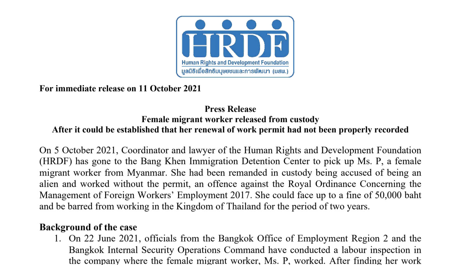 On 5 October 2021, Coordinator and lawyer of the Human Rights and Development Foundation (HRDF) has gone to the Bang Khen Immigration Detention Center to pick up Ms. P, a female migrant worker from Myanmar. She had been remanded in custody being accused of being an alien and worked without the permit, an offence against the Royal Ordinance Concerning the Management of Foreign Workers’ Employment 2017. She could face up to a fine of 50,000 baht and be barred from working in the Kingdom of Thailand for the period of two years.