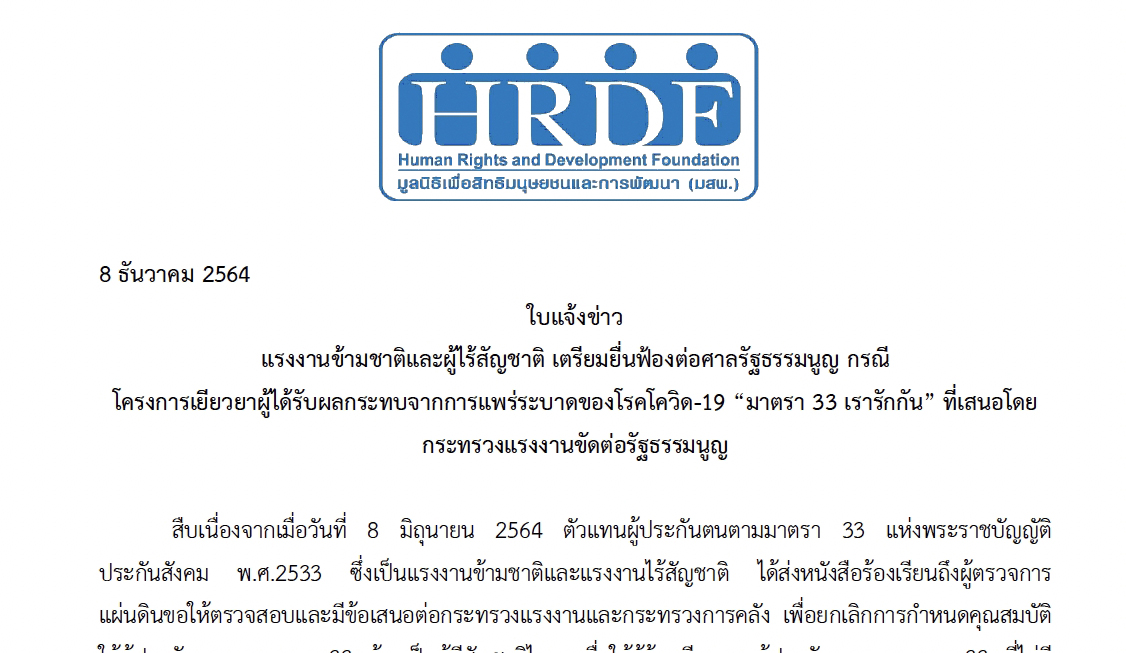 สืบเนื่องจากเมื่อวันที่ 8 มิถุนายน 2564 ตัวแทนผู้ประกันตนตามมาตรา 33 แห่งพระราชบัญญัติประกันสังคม พ.ศ.2533 ซึ่งเป็นแรงงานข้ามชาติและแรงงานไร้สัญชาติ ได้ส่งหนังสือร้องเรียนถึงผู้ตรวจการแผ่นดินขอให้ตรวจสอบและมีข้อเสนอต่อกระทรวงแรงงานและกระทรวงการคลัง เพื่อยกเลิกการกำหนดคุณสมบัติให้ผู้ประกันตนตามมาตรา 33 ต้องเป็นผู้มีสัญชาติไทย เพื่อให้ผู้ร้องเรียนและผู้ประกันตนตามมาตรา 33 ที่ไม่มีสัญชาติไทย เข้าถึงสิทธิในการได้รับเงินชดเชยเยียวยาตามโครงการ ม.33 เรารักกัน และโครงการอื่นของรัฐในอนาคตเพื่อให้เกิดการปฏิบัติอย่างเสมอภาคเท่าเทียมและเป็นธรรม รวมทั้งขอให้ผู้ตรวจการแผ่นดินเสนอเรื่องร้องเรียนดังกล่าวไปยังศาลรัฐธรรมนูญ ว่าการกำหนดเงื่อนไขของโครงการเป็นการกระทำที่เป็นการจำแนก กีดกัน และเลือกปฏิบัติโดยไม่เป็นธรรมขัดต่อมาตรา 4 และมาตรา 27 แห่งรัฐธรรมนูญแห่งราชอาณาจักรไทย พ.ศ.2560 หรือไม่