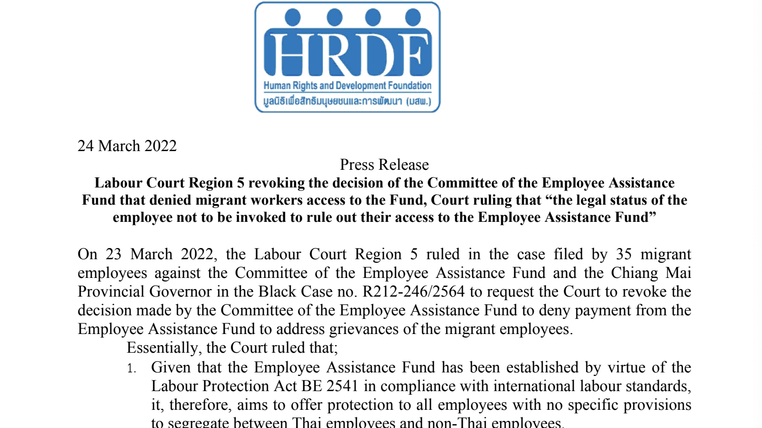 On 23 March 2022, the Labour Court Region 5 ruled in the case filed by 35 migrant employees against the Committee of the Employee Assistance Fund and the Chiang Mai Provincial Governor in the Black Case no. R212-246/2564 to request the Court to revoke the decision made by the Committee of the Employee Assistance Fund to deny payment from the Employee Assistance Fund to address grievances of the migrant employees. Essentially, the Court ruled that;