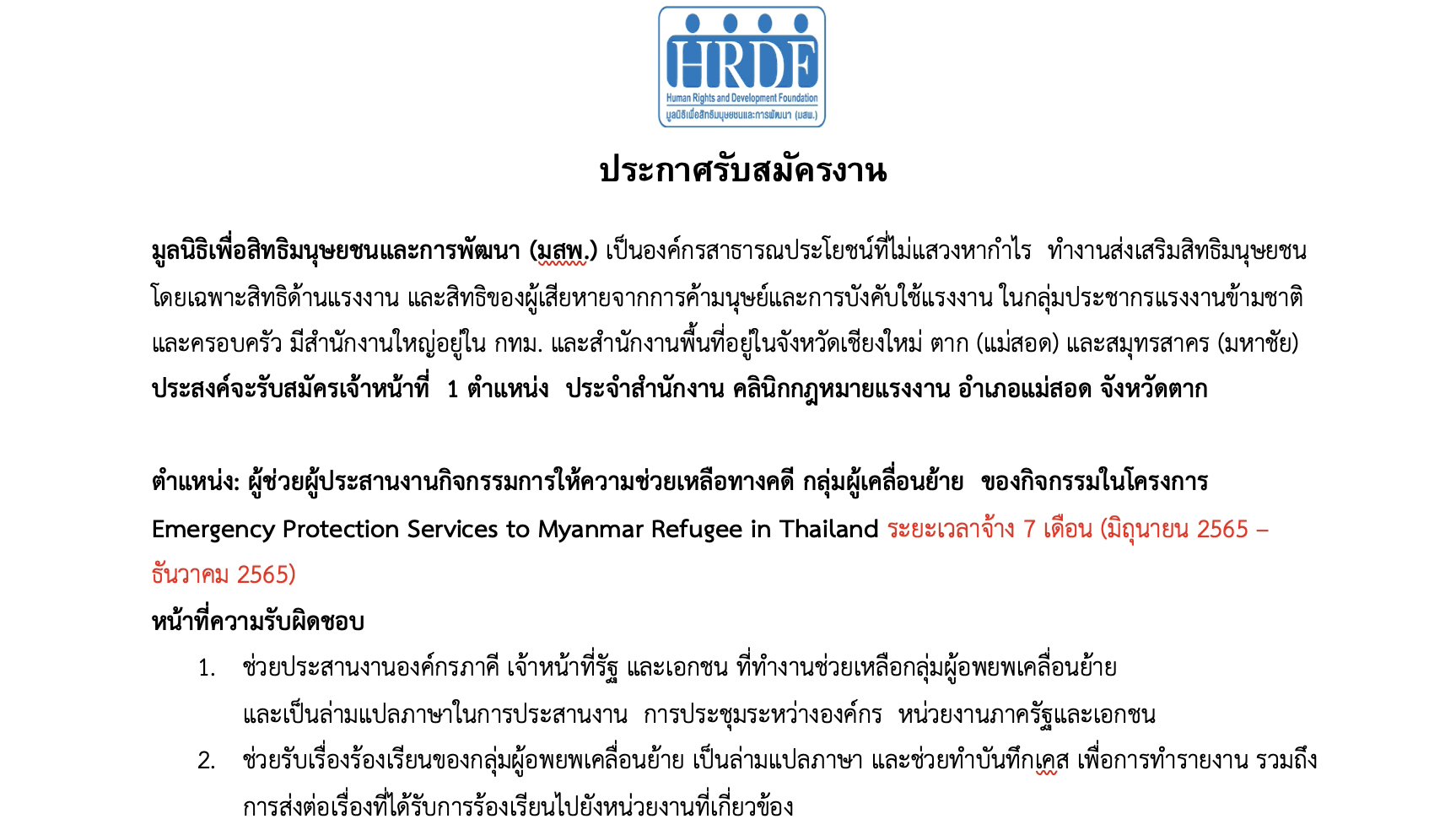 ตำแหน่ง: ผู้ช่วยผู้ประสานงานกิจกรรมการให้ความช่วยเหลือทางคดี กลุ่มผู้เคลื่อนย้าย ของกิจกรรมในโครงการ Emergency Protection Services to Myanmar Refugee in Thailand ระยะเวลาจ้าง 7 เดือน (มิถุนายน 2565 – ธันวาคม 2565)