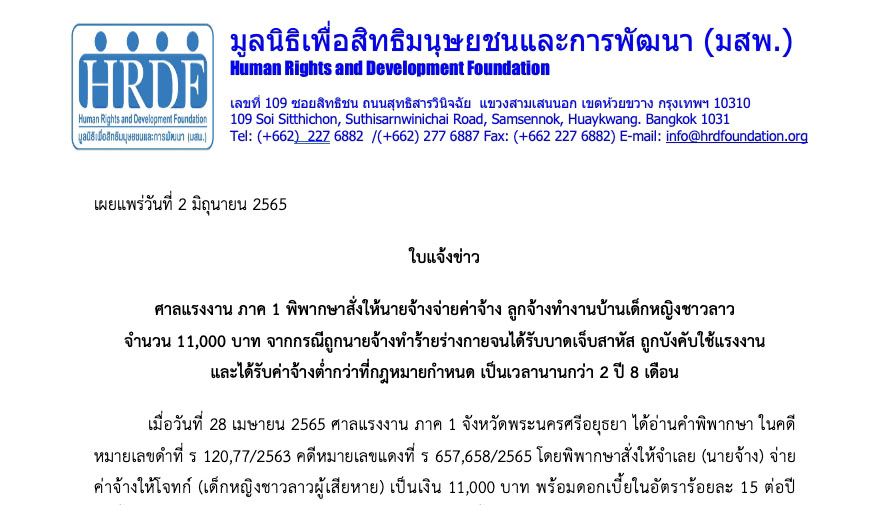 ศาลแรงงาน ภาค 1 พิพากษาสั่งให้นายจ้างจ่ายค่าจ้าง ลูกจ้างทำงานบ้านเด็กหญิงชาวลาว