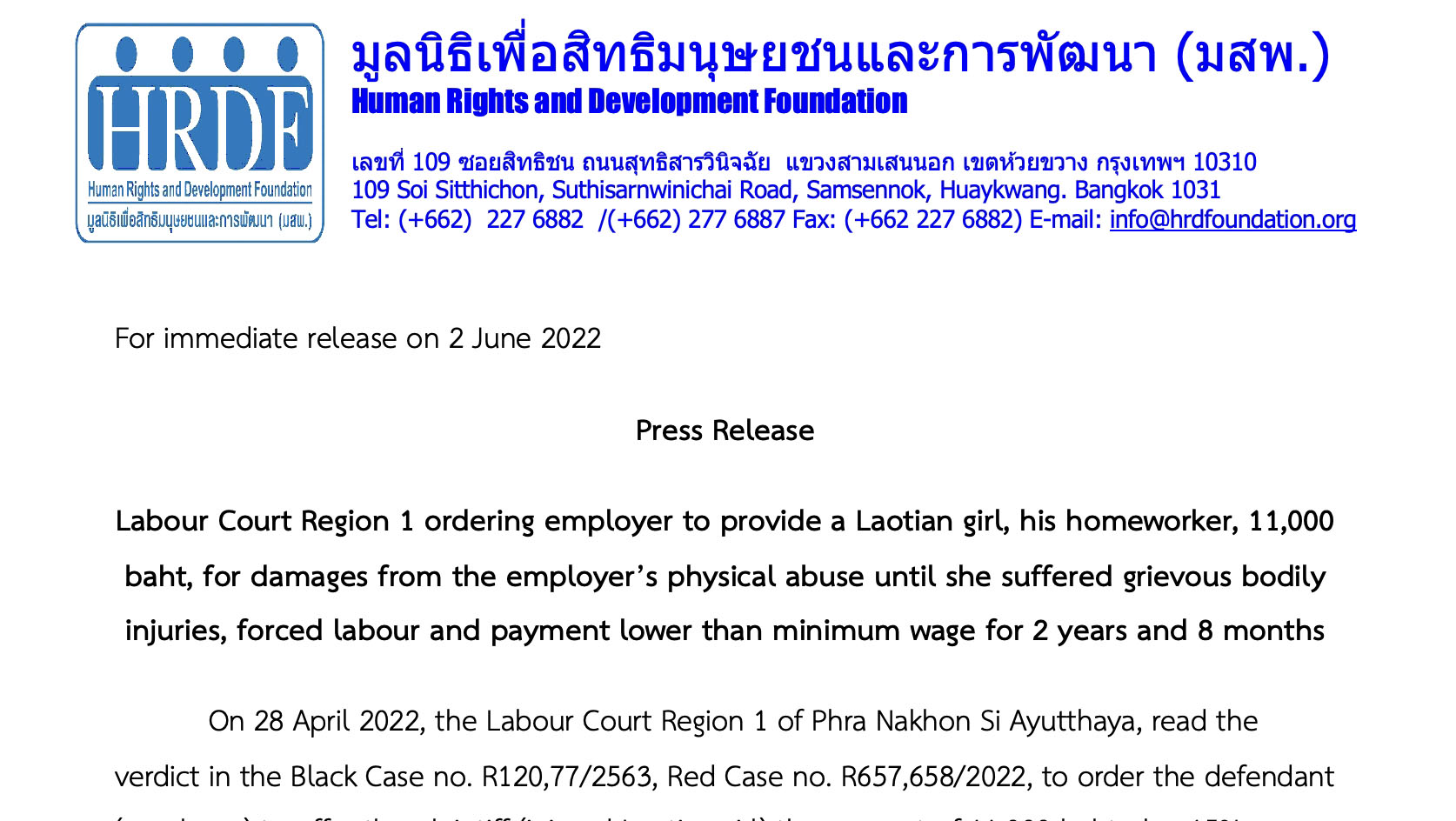 On 28 April 2022, the Labour Court Region 1 of Phra Nakhon Si Ayutthaya, read the verdict in the Black Case no. R120,77/2563, Red Case no. R657,658/2022, to order the defendant (employer) to offer the plaintiff (injured Laotian girl) the amount of 11,000 baht plus 15% interest rate per annum from 1 March 2018 until the sum is paid off. Previously, the labour inspector awarded the injured party the amount of 99,133.32 baht.