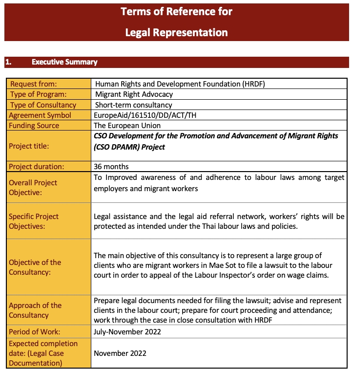 The consultant (and team) will complete the lawsuit as legal counsel for the abovementioned migrant workers and provide HRDF with a case report for monitoring the progress of court case.
