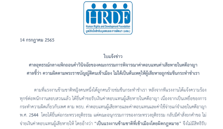 ตามที่แรงงานข้ามชาติหญิงคนหนึ่งได้ถูกคนร้ายข่มขืนกระทำชำเรา หลังจากทีแรงงานได้แจ้งความร้องทุกข์ต่อพนักงานสอบสวนแล้ว ได้ยื่นคำขอรับเงินค่าตอบแทนผู้เสียหายในคดีอาญา เนื่องจากเป็นเหยื่อของการกระทำความผิดเกี่ยวกับเพศ ตาม พรบ. ค่าตอบแทนผู้เสียหายและค่าตอบแทนและค่าใช้จ่ายแก่จำเลยในคดีอาญา พ.ศ. 2544 โดยได้ยื่นต่อกระทรวงยุติธรรม แต่คณะอนุกรรมการของกระทรวงยุติธรรม กลับมีคำสั่งยกคำขอ ไม่จ่ายเงินค่าตอบแทนผู้เสียหายให้ โดยอ้างว่า “เป็นแรงงานข้ามชาติที่เข้าเมืองโดยผิดกฎหมาย” จึงไม่มีสิทธิรับเงินดังกล่าว ผู้เสียหาย จึงได้ยื่นอุทธรณ์ต่อคณะกรรมการพิจารณาค่าตอบแทนค่าเสียหาย และค่าทดแทนและค่าใช้จ่ายแก่จำเลยในคดีอาญา แต่คณะกรรมการฯยังคงยืนตามวินิจฉัยเดิมของคณะอนุกรรมการฯ เป็นคำวินิจฉัยที่ 213/2564 ลงวันที่ 13 กันยายน 2564