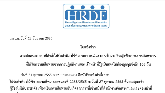 ศาลปกครองกลางมีคำสั่งไม่รับคำฟ้องไว้พิจารณา กรณีแรงงานข้ามชาติหญิงฟ้องกรมการจัดหางาน