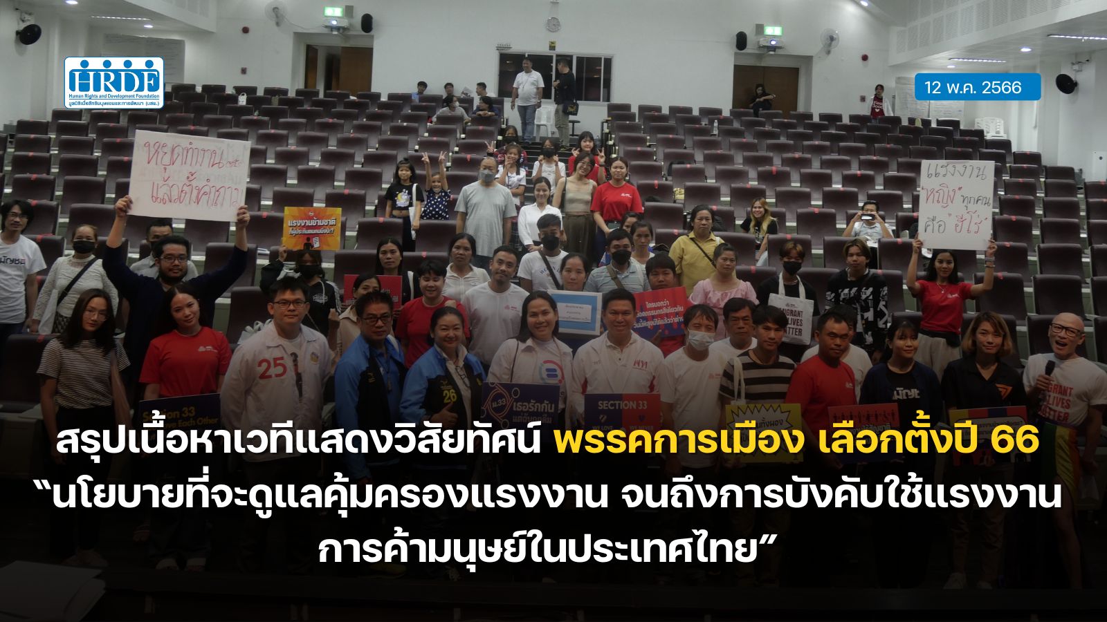 วันที่ 10 พ.ค.ที่ผ่านมา เวลา 13.30 – 16.00 น. ณ หอประชุมใหญ่ คณะนิติศาสตร์ มหาวิทยาลัยเชียงใหม่มูลนิธิสิทธิมนุษยชนและการพัฒนา (HRDF) ร่วมกับ ASIAN-AUSTRALIA Counter Trafficking ได้จัดเวทีรับฟังวิสัยทัศน์ของแต่ละพรรคการเมือง ในหัวข้อ “นโยบายที่จะดูแลแรงงาน คุ้มครองแรงงาน จนถึงการบังคับใช้แรงงาน จนสู่การค้ามนุษย์ในประเทศไทย” ซึ่งในครั้งนี้ มีทั้งหมด 6 พรรคการเมืองที่เข้าร่วม ได้แก่ พรรครวมเสรีรวมไทย, พรรคเพื่อไทย, พรรคเสมอภาค, พรรคประชาธิปปัตย์ , พรรคก้าวไกล, พรรคสามัญชน