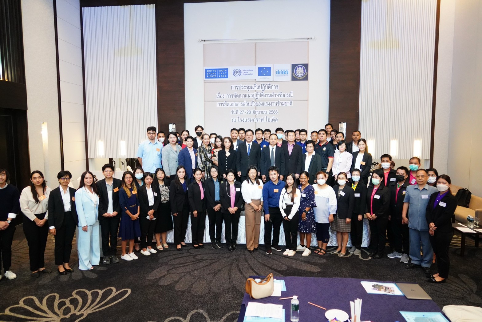 วันที่ 27-28 มิถุนายน 2566 ที่ผ่านมา มูลนิธิเพื่อสิทธิมนุษยชนและการพัฒนา (ม.ส.พ.) จัดงานอบรมเชิงปฏิบัติการ “การพัฒนาแนวปฏิบัติงานสำหรับกรณีการยึดเอกสารส่วนตัวข้ามแรงงานข้ามชาติ” ณ The Graph Hotels กรงุเทพมหานคร ซึ่งได้รับการสนับสนุนจากองค์การแรงงานระหว่างประเทศ (ILO) โครงการสิทธิจากเรือสู่ฝั่ง (Ship to Shore Rights) และกรมการจัดหางาน กระทรวงแรงงาน โดยกองทะเบียนจัดหางานกลางและคุ้มครองคนหางาน (กลุ่มงานควบคุมตรวจสอบการทำงานของคนต่างด้าว) กิจกรรมครั้งนี้มีจำนวนผู้เข้าร่วม จํานวน 70 คน ได้แก่ เจ้าหน้าที่จากสํานักงานจัดหางานพื้นที่และส่วนกลาง องค์กรภาคประชาสังคม และหน่วยงานราชการอื่นๆที่เกี่ยวข้อง
