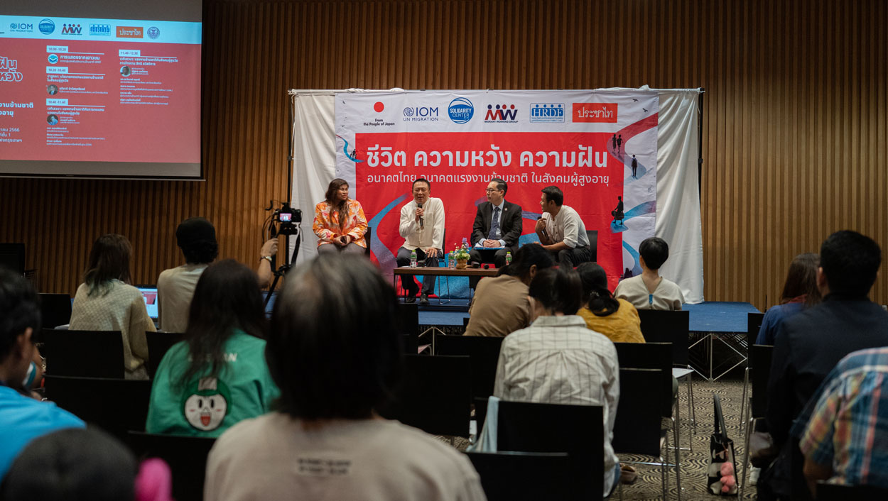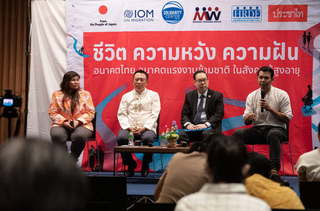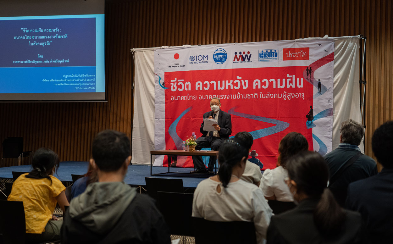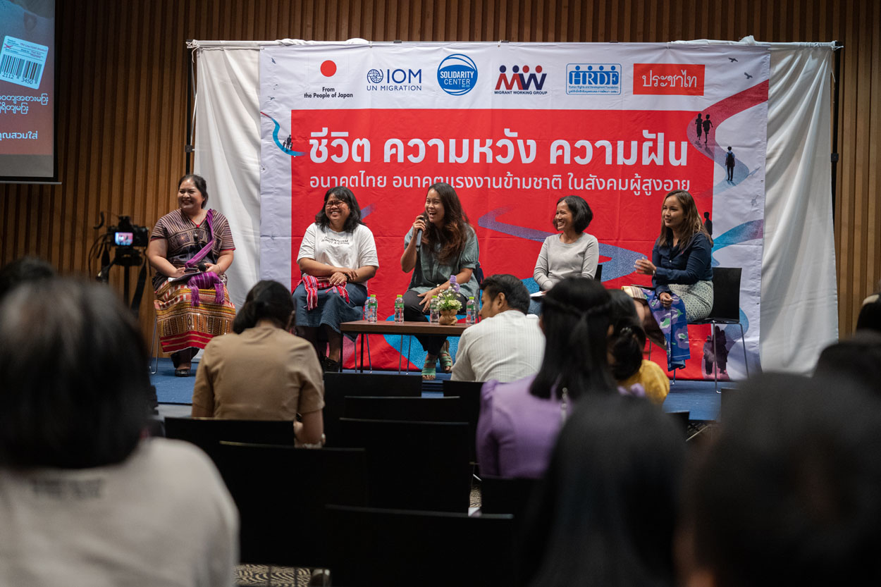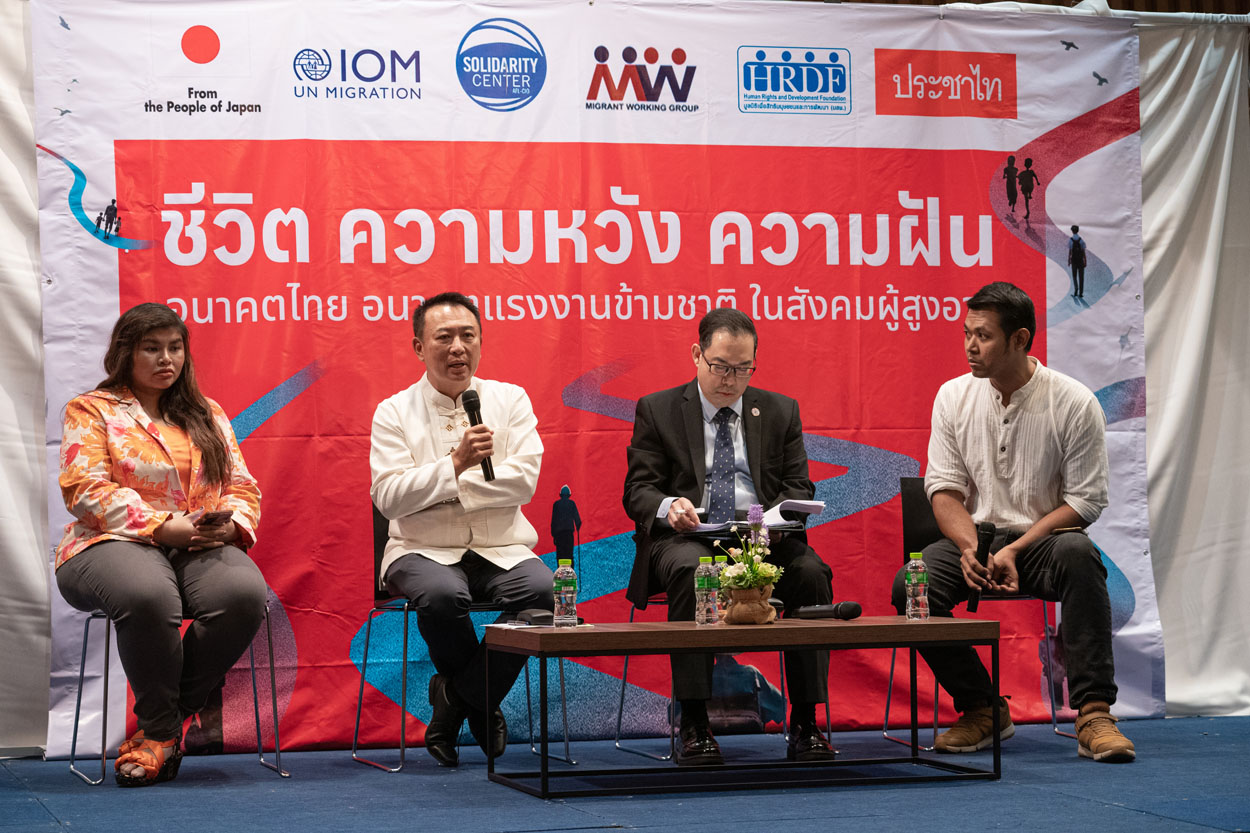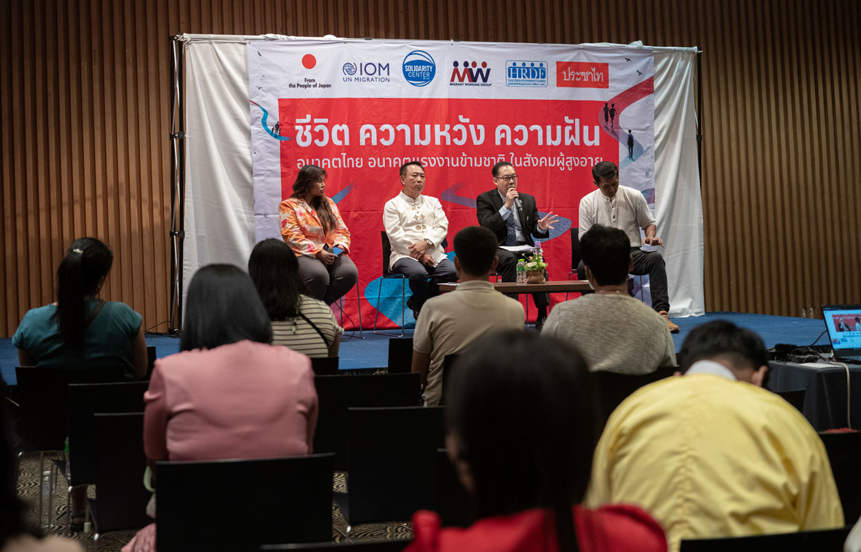 ขอขอบคุณวิทยากร และผู้ดำเนินรายการ กิจกรรมเสวนา ทั้ง 4 หัวข้อ นโยบายทดแทนแรงงานข้ามชาติในสังคมผู้สูงวัย, แรงงานข้ามชาติกับการทดแทนแรงงานในสังคมผู้สูงวัย, แรงงานข้ามชาติกับสังคมผู้สูงวัย : การจ้างงาน สิทธิ สวัสดิการ และแรงงานข้ามชาติในงานสื่อสารเพื่อลดอคติของคนทำงานในประเทศไทย