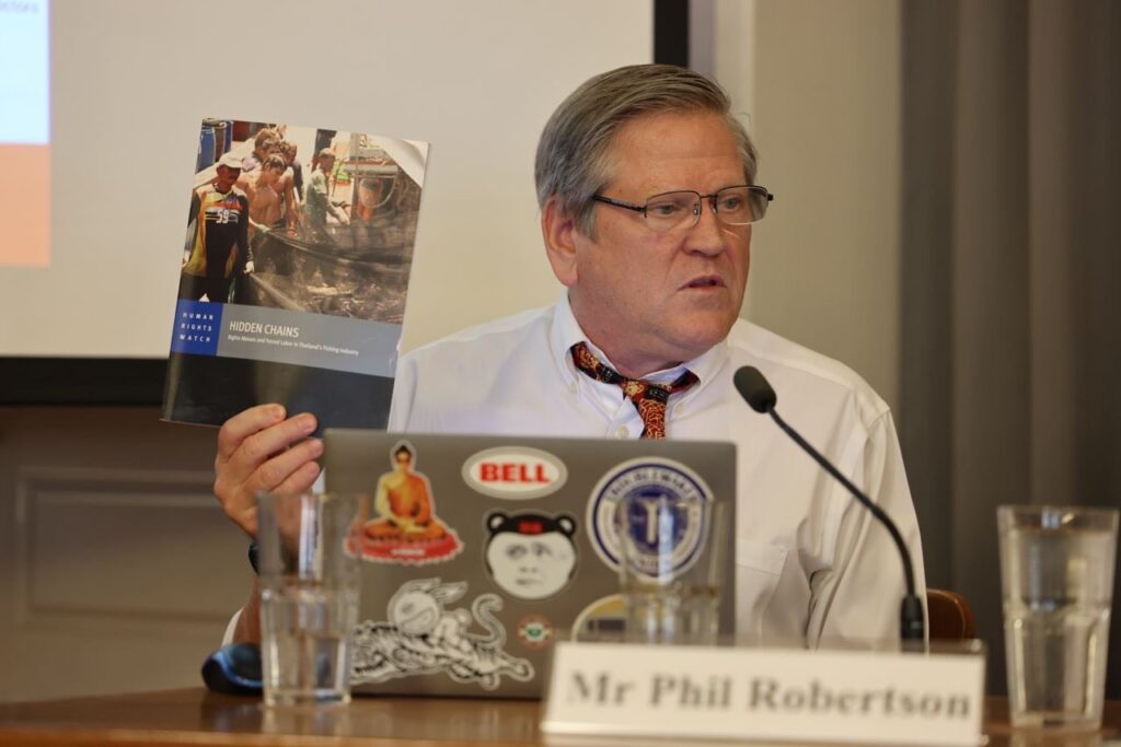 Dominic Thomson and Project Manager for Southeast Asia, Environmental Justice Foundation (EJF), describes changes in the administration of Thailand’s fishery under the Srettha Thavisin government during the global trade forum in which civil society shares their concern and proposes recommendations. In the past several years, Thailand has caused controversies at the international level concerning human rights violation, the use of forced labour and child labor. Meanwhile, reform in the fishery industry has made Thailand a pioneering leader in the region in terms of the sustainable, legal and fairer fishery and seafood export. Nonetheless, a backsliding trend regarding the administration of fishery industry could be observed and this may deal a big blow to human rights and Thailand’s reputation at the international level. It may thwart the attempt of the new administration to attract news foreign investments. Thomson further said that the relaxation of legal application could spell a trouble the existing fishery and seafood export measures. The export volume of seafood in 2021 reached 172 billion baht. But as far as Thailand’s international obligations regarding seafood traceability is concerned, this may prompt a number of buying countries to reconsider their purchase of seafood from Thailand. Responses to this problem must be made clear and transparent and instead of relaxing the legal application, it should be enhanced to ensure the sustainability of Thailand’s seafood industry and to ensure a safe working environment for workers as well as to ensure the sustainability of Thailand’s economy to pass on from generation to generation.