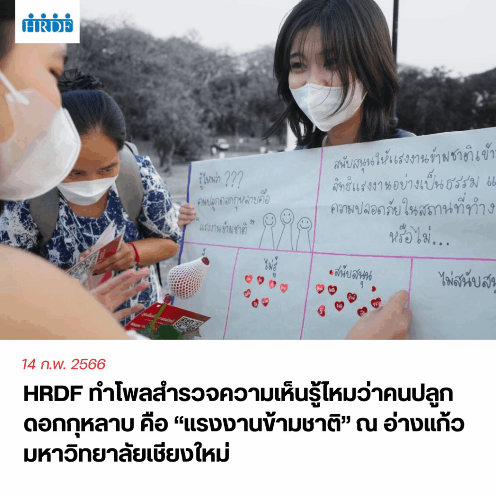 HRDF ร่วมกับตัวแทนแรงงานข้ามชาติและเครือข่ายสังคมในการสนับสนุนสิทธิแรงงานตามมาตรฐานสากลและการเสมอภาค อาทิการลงพื้นที่เก็บข้อมูล ลงพื้นที่เพื่อรณรงค์ออนไลน์ รณรงค์สาธารณะ จัดทำโพล แจกกุหลาบพร้อมการ์ดรณงค์ และจัดเวทีเสวนาปัญหาแรงงานภาคเกษตร