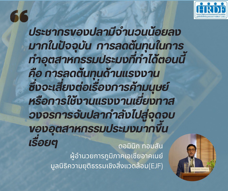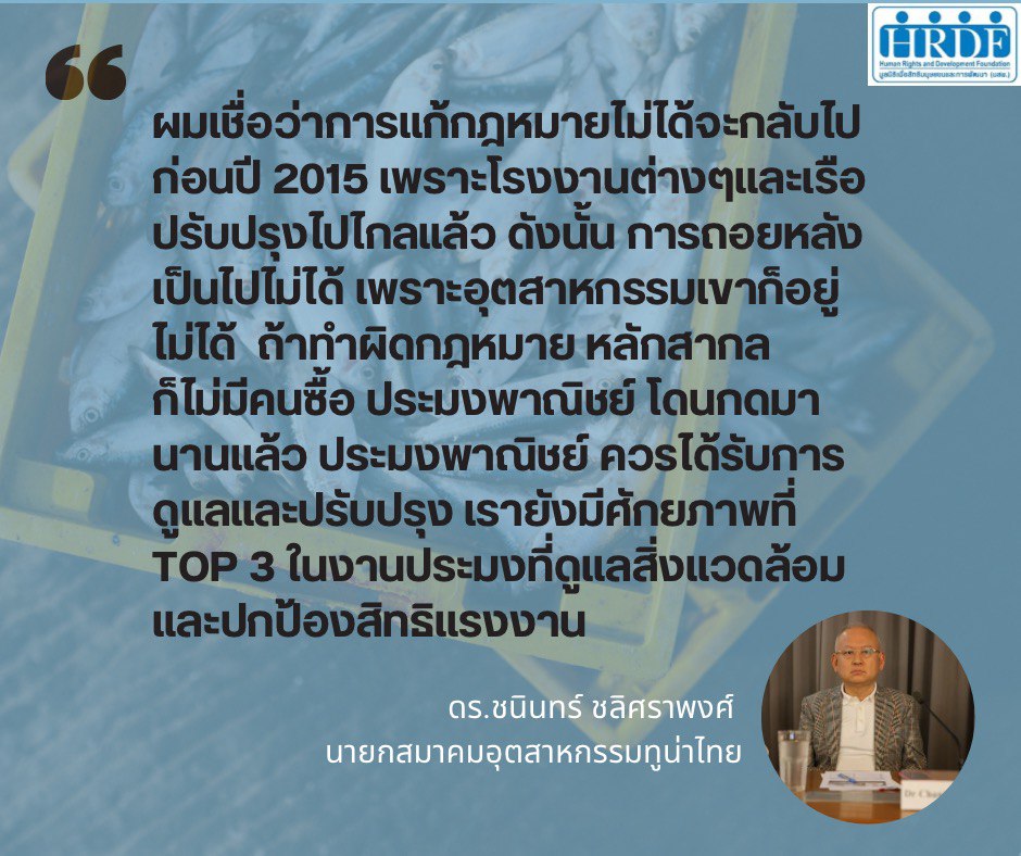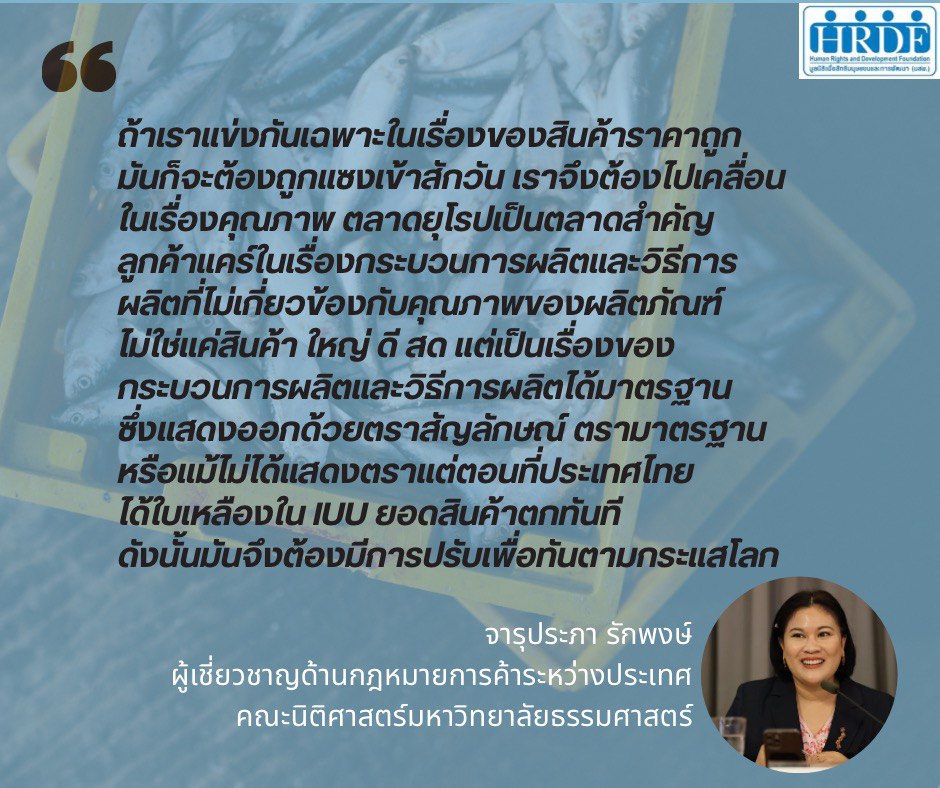 นอกจากนี้ทางองค์กรภาคประชาสังคม ได้มีการจัดเวทีเสวนาจับตาการแก้ไข พ.ร.ก.ประมง ฉบับปลดล็อกแก้ ‘ไอยูยู’ โดยเวทีเสวนา ‘สรุปทิศทางประมงไทยในบริบทการค้าระหว่างประเทศ : ข้อพิจารณาเรื่องสิทธิแรงงาน สิ่งแวดล้อม และมาตรฐานตลาดการค้าอาหารทะเล’ เมื่อวันที่ 18 ม.ค.2567 ที่สมาคมผู้สื่อข่าวต่างประเทศ (FCCT) ได้เสนอแนะแนวทางการปรับปรุงกฎหมายและความร่วมมือในการทำงานร่วมกันระหว่างภาคส่วนที่เกี่ยวข้อง – ผอ.EJF หวั่น ‘รัฐบาลเศรษฐา’ แก้ กม.ประมงทำสิทธิมนุษยชนถอยหลัง กระทบส่งออก 1.72 แสนล้านบาท – นายกสมาคมฯ ทูน่าไทย ชี้ประมงไทยไม่ยั่งยืนเพราะ “สกปรก-เสี่ยงสูง-งานยาก/งานหนัก” ถ้ารัฐไม่ส่งเสริมทุกส่วนจะถูกกีดกันทางการค้าโลก – นักวิชาการ มธ. แนะรัฐบาลสร้างมาตรฐานประมงยั่งยืน-สางปัญหา IUU ทำสินค้าให้ได้มาตรฐานยุโรปใส่ใจกระบวนการผลิตแข่งขันได้ทั่วโลก อ่านต่อได้ที่ https://hrdfoundation.org/?p=3438