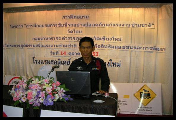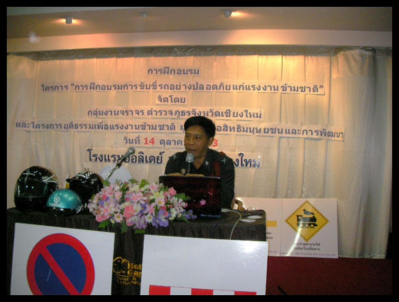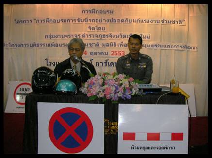 ให้เกียรติประธานกล่าวเปิดการฝึกอบรม เนื่องจากตามที่กรมขนส่งทางบกได้ประกาศเปลี่ยนแปลงนโยบาย โดยอนุญาตให้แรงงานข้ามชาติ สามารถจดทะเบียนมีชื่อเป็นเจ้าของรถและโอนรถได้ แม้จะยังไม่อนุญาตให้มีใบอนุญาตขับขี่ แต่มีแรงงานข้ามชาติจำนวนมากได้จดทะเบียนเป็นเจ้าของรถ และขับขี่รถบนทางโดยไม่มีหรือขาดความรู้ความเข้าใจเกี่ยวกับป้ายสัญญาณจราจร เครื่องหมายจราจร สัญญาณจราจร และลักษณะการขับขี่ที่ถูกต้อง ซึ่งอาจก่อให้เกิดอุบัติเหตุทางถนนเพิ่มขึ้น ทางมูลนิธิและกลุ่มงานจราจรได้ตะหนักถึงความสำคัญของปัญหาดังกล่าว จึงจัดให้มีการสัมนาให้ความรู้ความเข้าใจการขับขี่ปลอดภัยแก่แรงงานข้ามชาติดังกล่าวขึ้นเมื่อวันที่ 14 ตุลาคม 2553 ระหว่างเวลา 08.30 น.-16.00 น. ณ ห้องสิริภูมิ โรงแรมฮอลลิเดย์ การ์เด้น มูลนิธิเพื่อสิทธิมนุษยชนและการพัฒนา (มสพ. หรือ Human Rights and Development Foundation) โดยคุณสมชาย หอมละออ เลขานุการมูลนิธิฯและคณะ ได้ร่วมกับกลุ่มงานจราจร จัดการอบรมสัมนาให้ความรู้ด้านกฎหมายจราจรและวิธีการขับขี่ปลอดภัย แก่ผู้ใช้แรงงานข้ามชาติ สัญชาติพม่าและบุคคลไร้สัญชาติ รวมจำนวน 150 คน โดยท่าน พันตำรวจเอกอนุ เนินหาด ผู้กำกับการกลุ่มงานจราจร