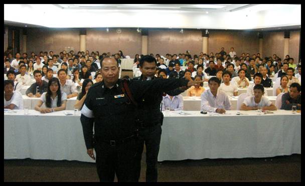 ด.ต.ณรงค์ ปัญญาชื่น (หลัง) และ ด.ต.ธงทอง วรรณา (กางแขน) วิทยากรบรรยายให้ความรู้การให้สัญญาณมือและแขน