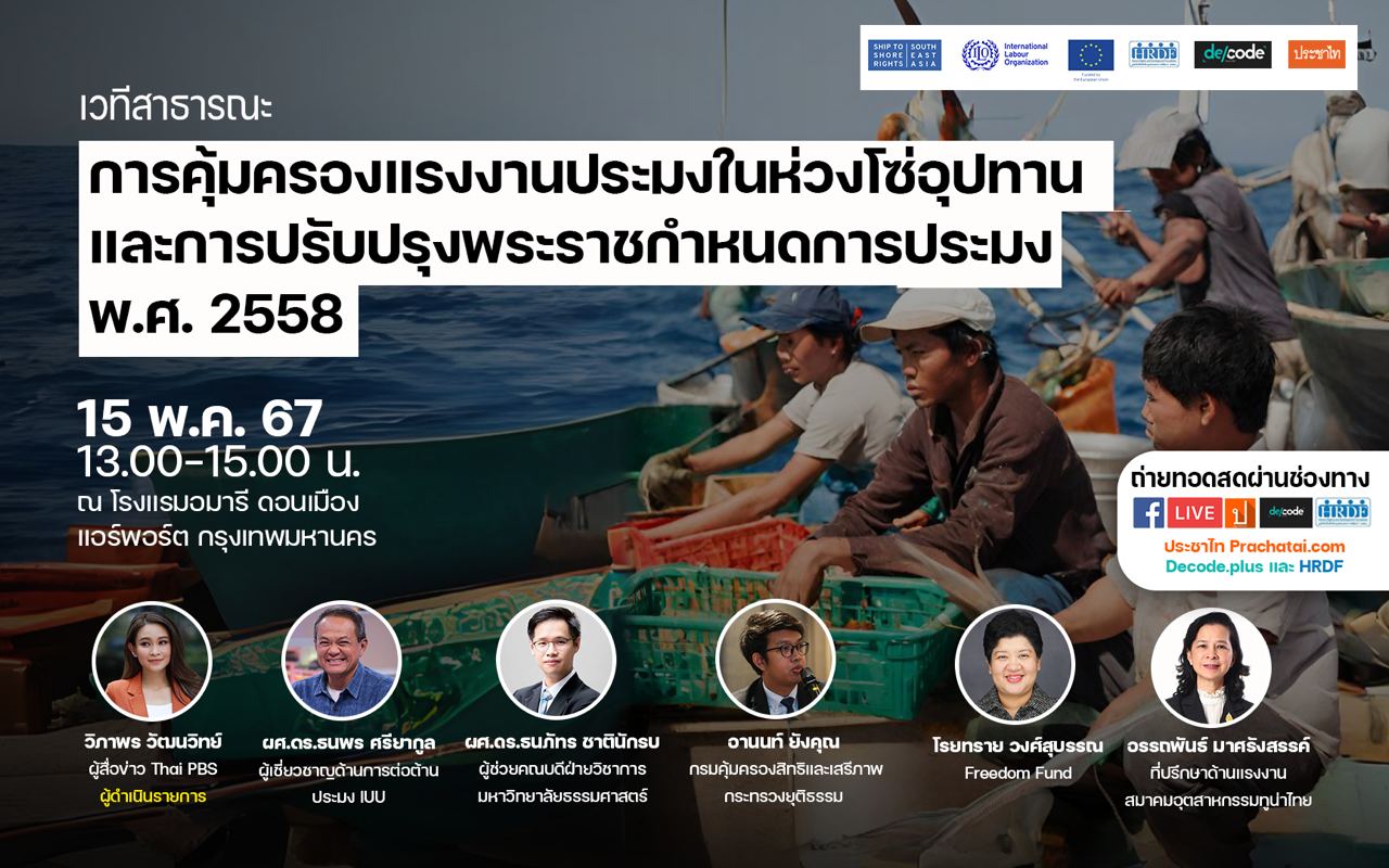 เพื่อเป็นการเสริมสร้างความรู้ความเข้าใจและแสวงหาแนวทางความร่วมมือระหว่างหน่วยงานภาครัฐและภาคประชาสังคมมูลนิธิเพื่อสิทธิมนุษยชนและการพัฒนา (HRDF) และสื่อมวลชน จึงจัดเวทีสาธารณะ “การคุ้มครอง #แรงงานประมง ในห่วงโซ่อุปทานและการปรับปรุง #พระราชกำหนดการประมง พ.ศ. 2558” ในวันที่15 พฤษภาคม 2567 เวลา 13.00-15.00 น. ที่ โรงแรมอมารี ดอนเมือง แอร์พอร์ต กรุงเทพมหานคร