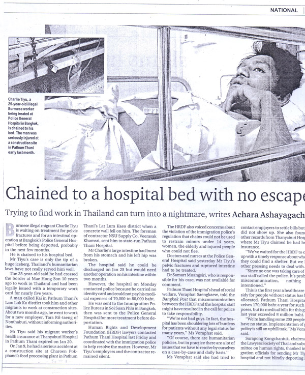 น.ส.ปรียาภร ขันกำเหนิด ผู้ประสานงานโครงการยุติธรรมเพื่อ แรงงานข้ามชาติ มูลนิธิสิทธิมนุษยชนและการพัฒนา เข้ายื่นหนังสือร้องเรียนต่อ พล.ต.อ.วิเชียร พจน์โพธ์ศรี ผู้บัญชาการตำรวจแห่งชาติ โดยมี พล.ต.ต.ประวุฒิ ถาวรศิริ โฆษกสำนักงานตำรวจแห่งชาติ รับหนังสือเรียกร้องให้ปลดโซ่ล่าม นายชาลี ดียู แรงงานชาวพม่า ที่ประสบอุบัติเหตุจากการทำงานจนได้รับบาดเจ็บสาหัส และอยู่ในระหว่างพักรักษาตัวที่โรงพยาบาลตำรวจ