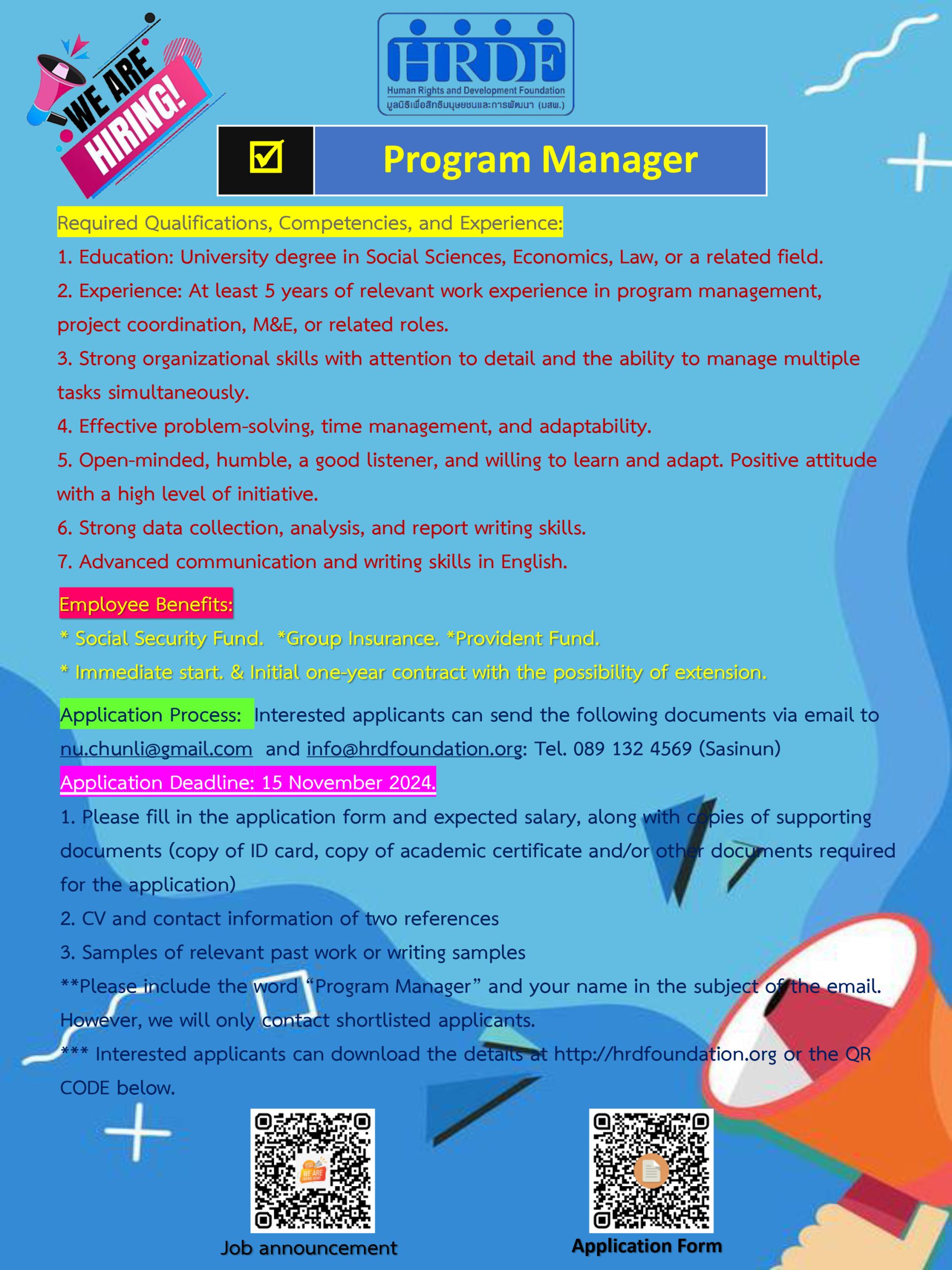 As the Program Manager, you will play a leadership role in managing HRDF’s program portfolio across five chapters: Bangkok, Chiang Mai, Mae Sot (Tak), Samut Sakhon, and Phuket. Your responsibilities will include supporting the implementation of ongoing projects, developing new project proposals, and coordinating with project teams, funders, and external stakeholders. Based in HRDF’s Bangkok office, you will assist the Program Director in delivering multi-funder programs, supporting financial and operational management, and ensuring project success. Extensive travel to field offices and project sites will be required.
