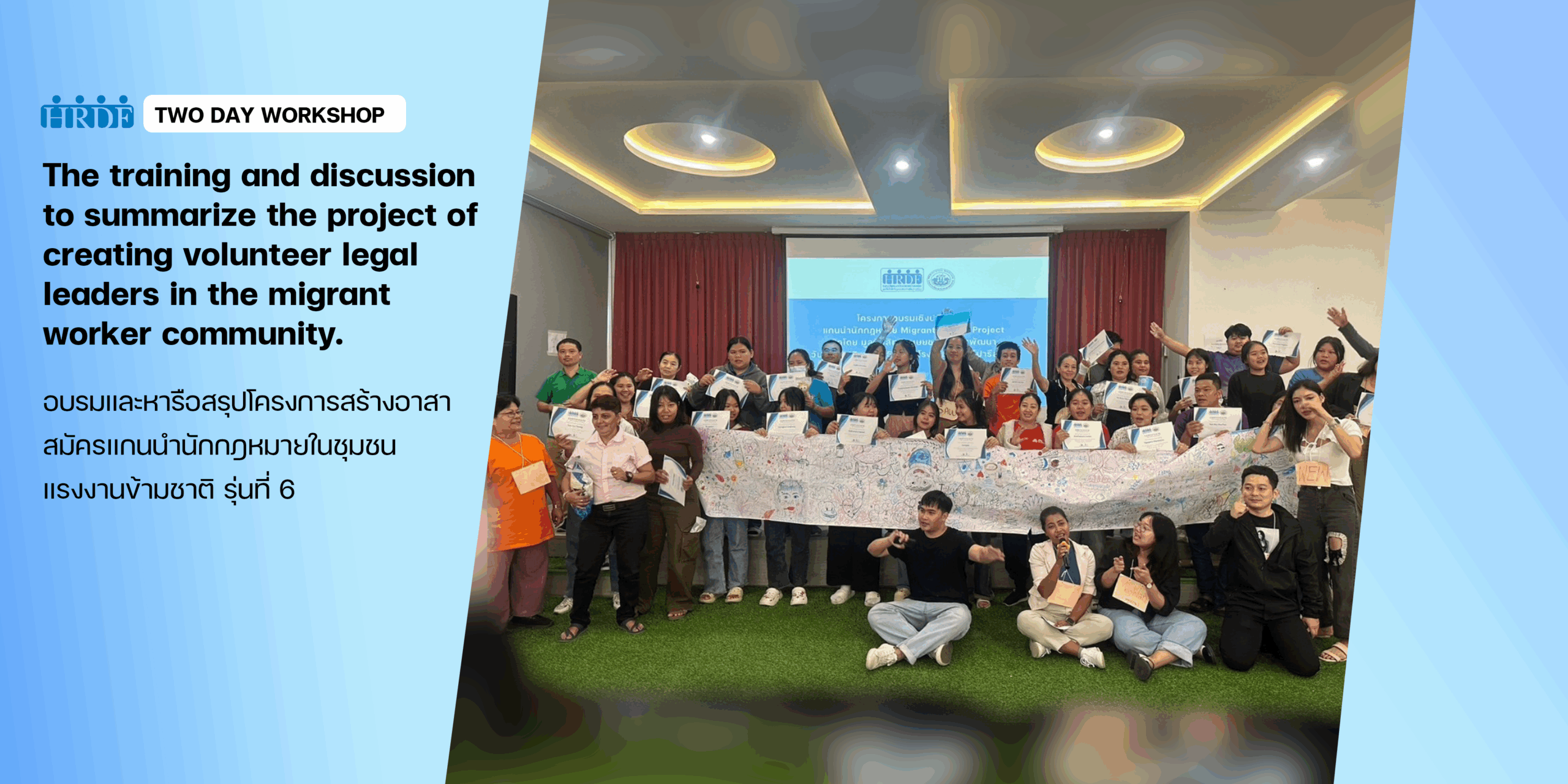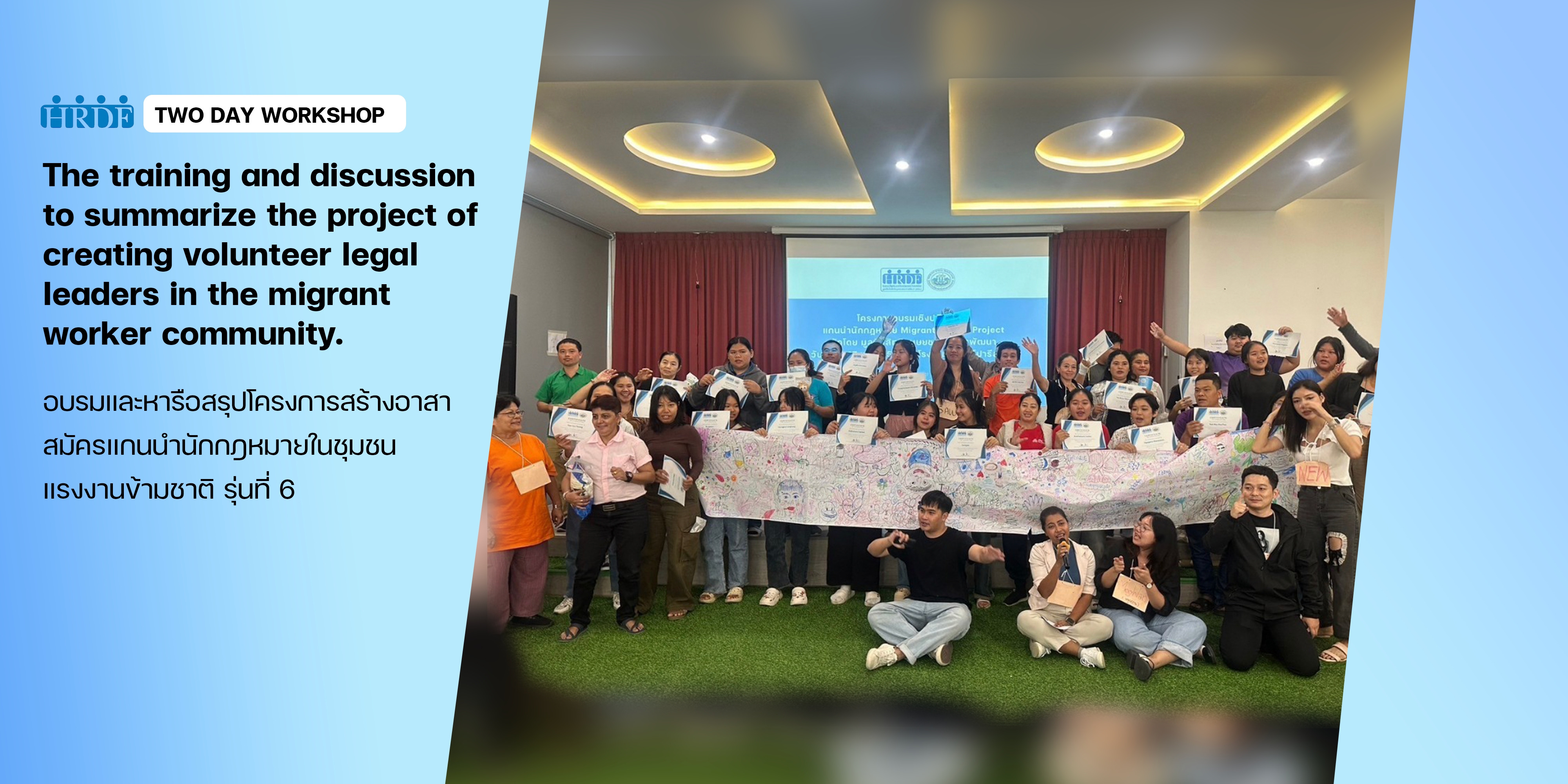 มูลนิธิเพื่อสิทธิมนุษยชนและการพัฒนา ร่วมกับกลุ่มคนงานหญิงเพื่อความยุติธรรม และสหพันธ์คนงานข้ามชาติ จัดการอบรมและหารือสรุปโครงการสร้างอาสาสมัครแกนนำนักกฎหมายในชุมชนแรงงานข้ามชาติ รุ่นที่ 6 โดยครอบคลุมพื้นที่จังหวัดเชียงใหม่และลำพูน ณ โรงแรมแกรนด์ปา รีสอร์ท จังหวัดลำพูน