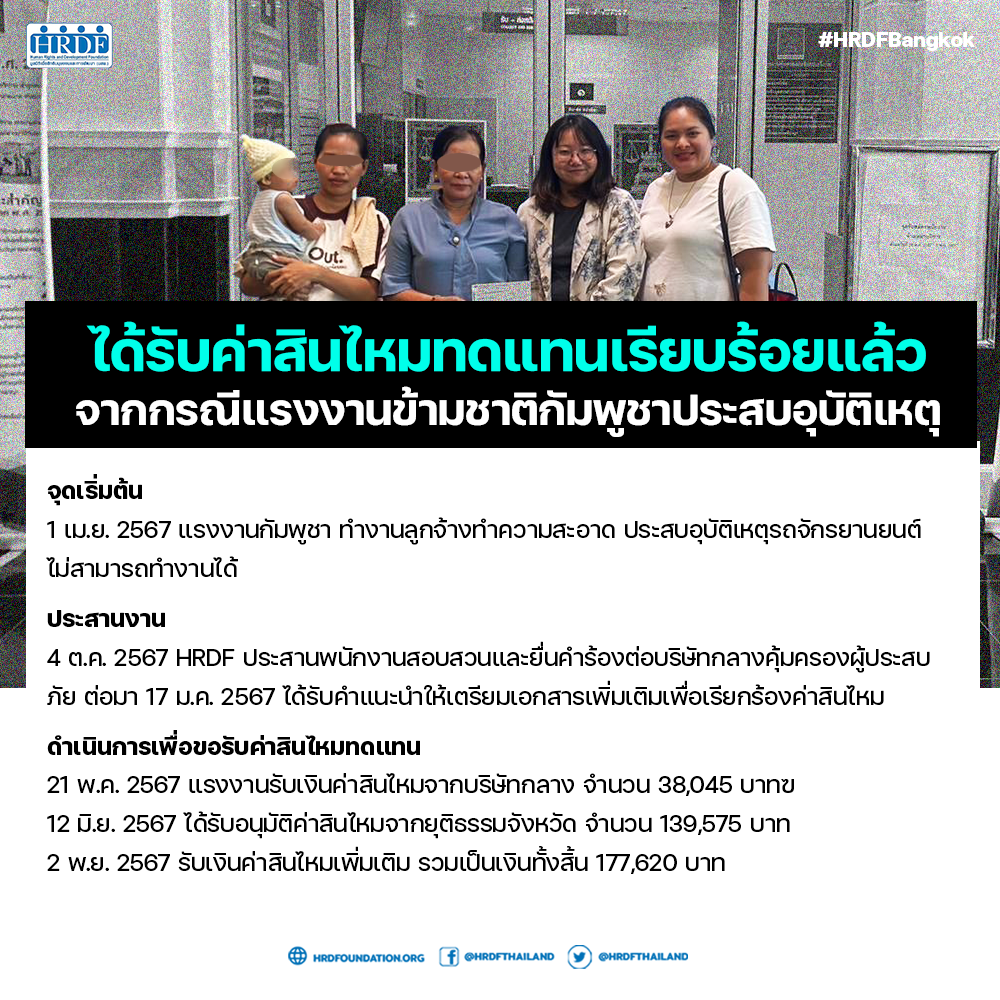 เมื่อวันที่ 28 กันยายน 2567 แรงงานข้ามชาติชาวกัมพูชา ซึ่งมีอาชีพเป็นลูกจ้างทำความสะอาดในจังหวัดสมุทรปราการ ประสบอุบัติเหตุรถจักรยานยนต์เฉี่ยวชน ส่งผลให้ได้รับบาดเจ็บจนไม่สามารถทำงานได้ตั้งแต่วันที่ 1 เมษายน 2567 ที่ผ่านมา
