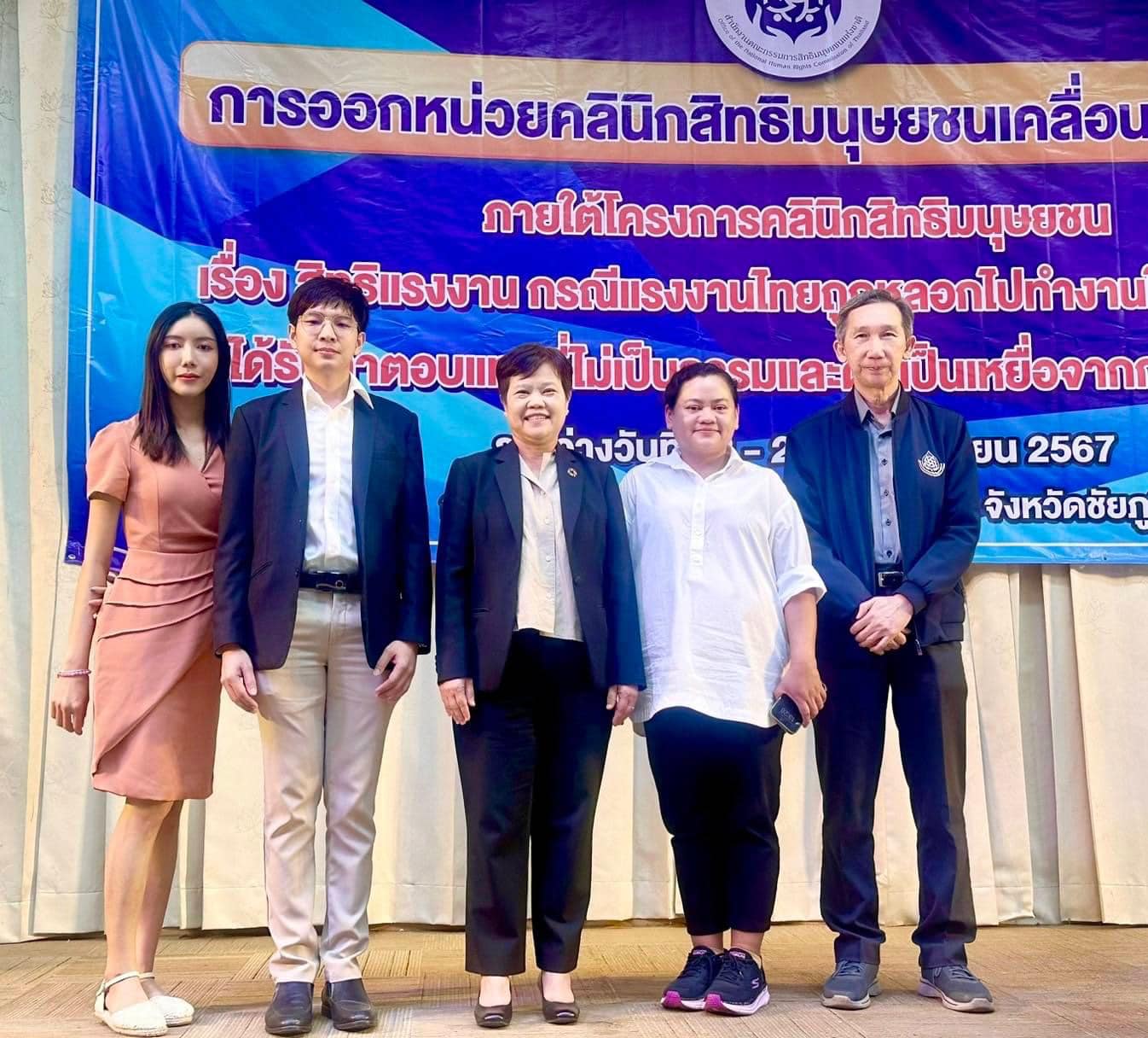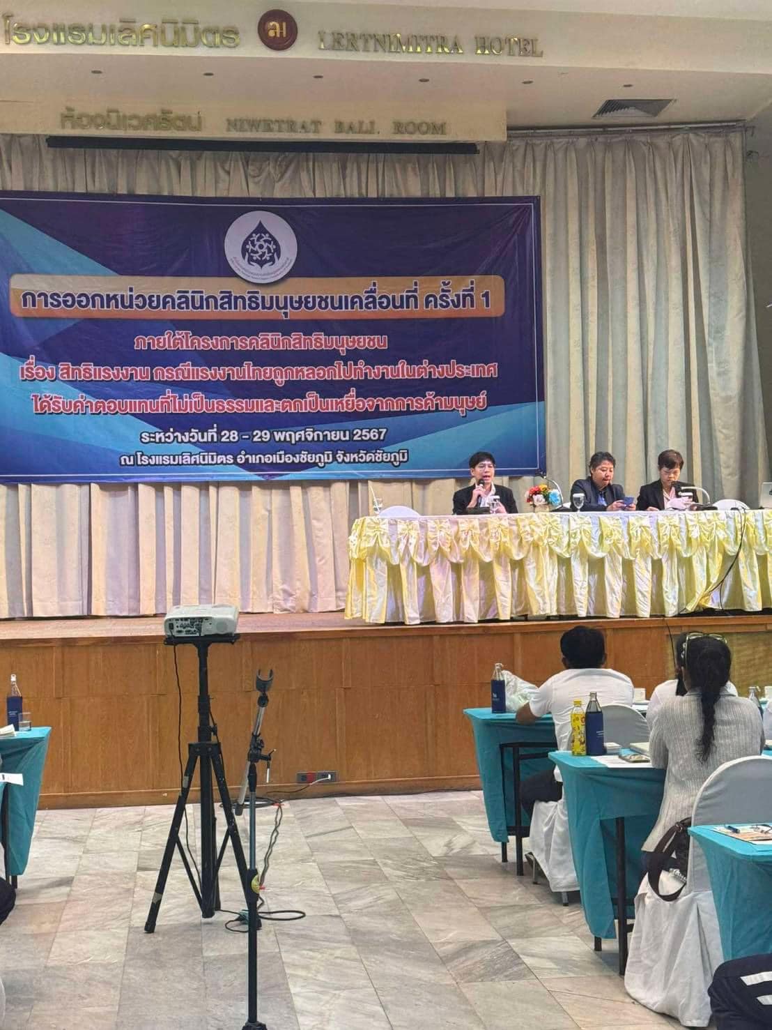 วันที่ 28-29 พฤศจิกายน 2567 คุณบุญแทน ตันสุเทพวีรวงศ์ กรรมการและเลขานุการ ว่าที่ร้อยตรีวัชรวิชญ์ วุฒิพัชระพัชร์ คุณนันทวุฒิ แหบคงเหล็ก และคุณเอ มา โช ตัวแทนเจ้าหน้าที่มูลนิธิเพื่อสิทธิมนุษยชนและการพัฒนา ร่วมประชุมกับสำนักงานคณะกรรมการสิทธิมนุษยชนแห่งชาติ ออกหน่วยคลินิกสิทธิมนุษยชนเคลื่อนที่ ครั้งที่ 1 ภายใต้โครงการคลินิกสิทธิมนุษยชน เรื่อง สิทธิแรงงาน กรณีแรงงานไทยถูกหลอกไปทำงานในต่างประเทศ ได้รับค่าตอบแทนที่ไม่เป็นธรรมและตกเป็นเหยื่อจากการค้ามนุษย์ ณ โรงแรมเลิศนิมิตร อำเภอเมืองชัยภูมิ จังหวัดชัยภูมิ ผู้เข้าร่วมเป็นแรงงานไทยประมาณ 120 คน