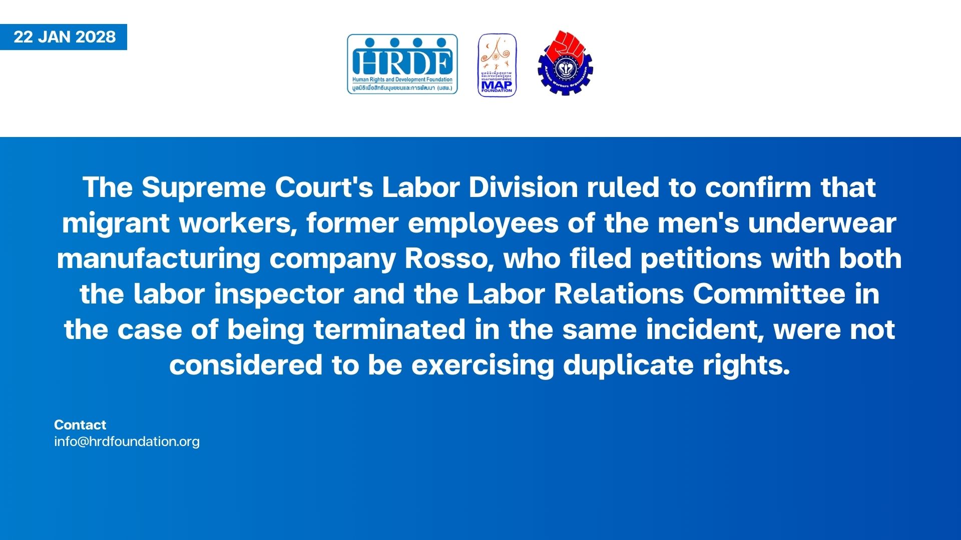 The Supreme Court’s Labor Division ruled to confirm that migrant workers, former employees of the men’s underwear manufacturing company Rosso, who filed petitions with both the labor inspector and the Labor Relations Committee in the case of being terminated in the same incident, were not considered to be exercising duplicate rights.