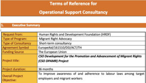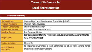 The consultant (and team) will complete the law enforcement as legal counsel for the above-mentioned migrant workers and provide HRDF with a case report for monitoring the progress of accessing the remedy case.