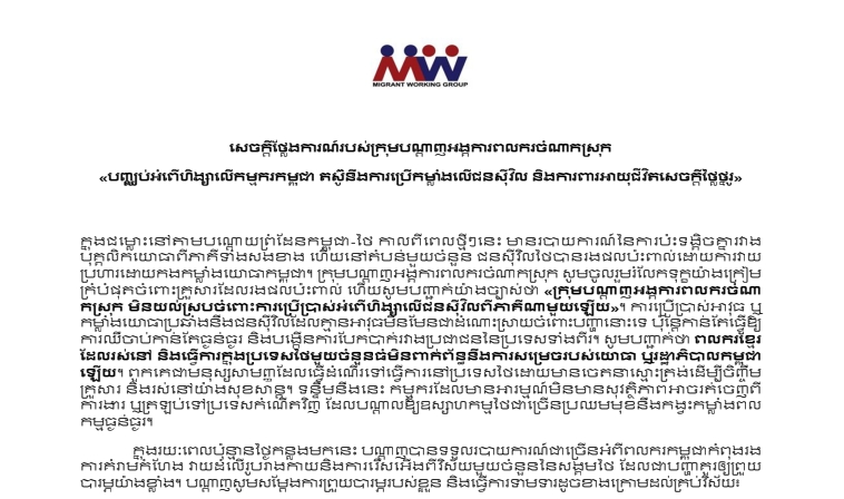 ក្នុងជម្លោះនៅតាមបណ្តោយព្រំដែនកម្ពុជា-ថៃ កាលពីពេលថ្មីៗនេះ មានរបាយការណ៍នៃការប៉ះទង្គិចគ្នារវាងបុគ្គលិកយោធាពីភាគីទាំងសងខាង ហើយនៅតំបន់មួយចំនួន ជនស៊ីវិលថៃបានរងផលប៉ះពាល់ដោយការវាយប្រហារដោយកងកម្លាំងយោធាកម្ពុជា។ ក្រុមបណ្តាញអង្គការពលករចំណាកស្រុក សូមចូលរួមរំលែកទុក្ខយ៉ាងក្រៀមក្រំបំផុតចំពោះគ្រួសារដែលរងផលប៉ះពាល់ ហើយសូមបញ្ជាក់យ៉ាងច្បាស់ថា «ក្រុមបណ្តាញអង្គការពលករចំណាកស្រុក មិនយល់ស្របចំពោះការប្រើប្រាស់អំពើហិង្សាលើជនស៊ីវិលពីភាគីណាមួយឡើយ»។ ការប្រើប្រាស់អាវុធ ឬកម្លាំងយោធាប្រឆាំងនឹងជនស៊ីវិលដែលគ្មានអាវុធមិនមែនជាដំណោះស្រាយចំពោះបញ្ហានោះទេ ប៉ុន្តែកាន់តែធ្វើឱ្យការឈឺចាប់កាន់តែធ្ងន់ធ្ងរ និងបង្កើនការបែកបាក់រវាងប្រជាជននៃប្រទេសទាំងពីរ។ សូមបញ្ជាក់ថា ពលករខ្មែរដែលរស់នៅ និងធ្វើការក្នុងប្រទេសថៃមួយចំនួនធំមិនពាក់ព័ន្ធនឹងការសម្រេចរបស់យោធា ឬរដ្ឋាភិបាលកម្ពុជាឡើយ។ ពួកគេជាមនុស្សសាមញ្ញដែលធ្វើដំណើរទៅធ្វើការនៅប្រទេសថៃដោយមានចេតនាស្មោះត្រង់ដើម្បីចិញ្ចឹមគ្រួសារ និងរស់នៅយ៉ាងសុខសាន្ត។ ទន្ទឹមនឹងនេះ កម្មករដែលមានអារម្មណ៍មិនមានសុវត្ថិភាពអាចរត់ចេញពីការងារ ឬត្រឡប់ទៅប្រទេសកំណើតវិញ ដែលបណ្តាលឱ្យឧស្សាហកម្មថៃជាច្រើនប្រឈមមុខនឹងកង្វះកម្លាំងពលកម្មធ្ងន់ធ្ងរ។