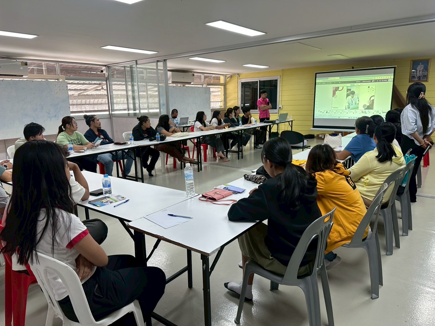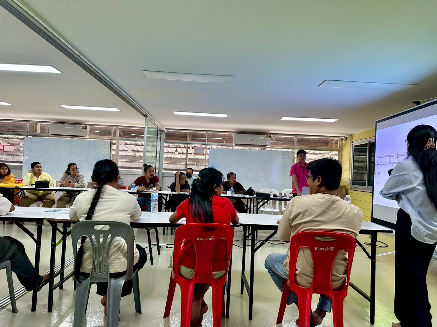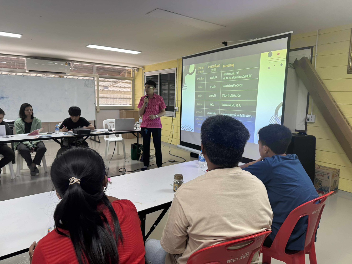 เริ่มต้นด้วยการทำแบบทดสอบก่อนเรียน (Pre-Test) เพื่อประเมินความรู้เบื้องต้นเกี่ยวกับ สิทธิแรงงาน สิทธิประกันสังคม กองทุนเงินทดแทน ต่อด้วยการบรรยายเนื้อหาทั้งสามหัวข้อ โดยคุณ วัชรวิชญ์ วุฒิพัชระพัชร์ ซึ่งให้ความรู้เกี่ยวกับวันหยุด วันลา ค่าจ้าง ค่าชดเชย การใช้แบบฟอร์มทางกฎหมาย กลไกการเข้าถึงสิทธิ์และเงื่อนไขต่างๆ รวมถึงให้ผู้เข้าร่วมมีส่วนเกี่ยวข้องในการอบรมด้วย