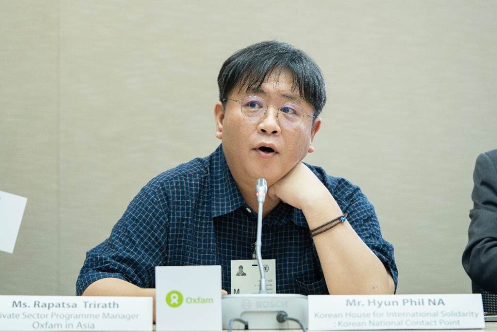 ฮยอนพิล นา Hyunpil Na (KHIS, เกาหลีใต้) นักพัฒนาสังคม ได้กล่าวถึงหัวข้อ กลไกจุดประสานงานแห่งชาติของ OECD (OECD National Contact Point: NCP) และได้นำเสนอบทเรียนจากกลไก NCP ของ OECD ในเกาหลีเผยให้เห็นทั้งข้อจำกัดและคุณค่าในการช่วยดึงความสนใจไปที่การละเมิดสิทธิมนุษยชนผ่านบทเรียนจากเกาหลีใต้