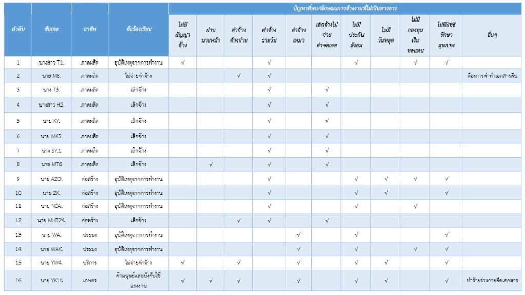 | ภาคการผลิต | 8 | เลิกจ้างไม่จ่ายค่าชดเชย,ค่าจ้างรายวัน, ค่าจ้างค้างจ่าย, ไม่มีสัญญาจ้าง, ไม่มีประกันสังคม, ไม่มีประกันสุขภาพ, ผ่านนายหน้า |