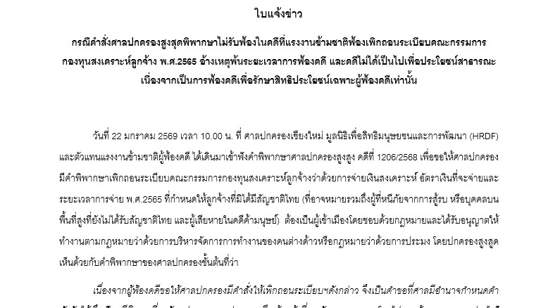 วันที่ 22 มกราคม 2569 เวลา 10.00 น. ที่ ศาลปกครองเชียงใหม่ มูลนิธิเพื่อสิทธิมนุษยชนและการพัฒนา (HRDF) และตัวแทนแรงงานข้ามชาติผู้ฟ้องคดี ได้เดินมาเข้าฟังคำพิพากษาศาลปกครองสูงสูง คดีที่ 1206/2568 เพื่อขอให้ศาลปกครองมีคำพิพากษาเพิกถอนระเบียบคณะกรรมการกองทุนสงเคราะห์ลูกจ้างว่าด้วยการจ่ายเงินสงเคราะห์ อัตราเงินที่จะจ่ายและระยะเวลาการจ่าย พ.ศ.2565 ที่กำหนดให้ลูกจ้างที่มิได้มีสัญชาติไทย (ที่อาจหมายรวมถึงผู้ที่หนีภัยจากการสู้รบ หรือบุคคลบนพื้นที่สูงที่ยังไม่ได้รับสัญชาติไทย และผู้เสียหายในคดีค้ามนุษย์) ต้องเป็นผู้เข้าเมืองโดยชอบด้วยกฎหมายและได้รับอนุญาตให้ทำงานตามกฎหมายว่าด้วยการบริหารจัดการการทำงานของคนต่างด้าวหรือกฎหมายว่าด้วยการประมง โดยปกครองสูงสูดเห็นด้วยกับคำพิพากษาของศาลปกครองชั้นต้นที่ว่า