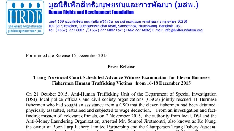 Press Release: Trang Provincial Court Scheduled Advance Witness Examination for Eleven Burmese Fishermen Human Trafficking Victims from 16-18 December 2015
