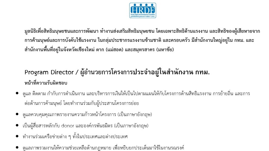 รับสมัคร : Program Director / ผู้อำนวยการโครงการประจำอยู่ในสำนักงาน กทม.