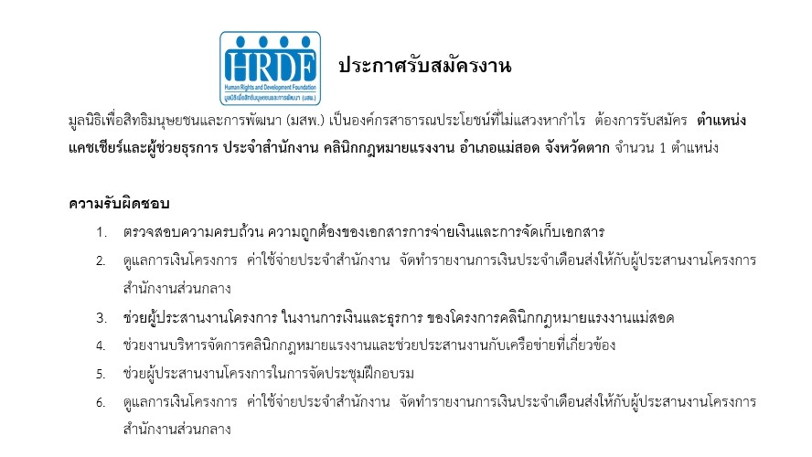 รับสมัคร: แคชเชียร์และผู้ช่วยธุรการ ประจำสำนักงาน คลินิกกฎหมายแรงงาน อำเภอแม่สอด จังหวัดตาก