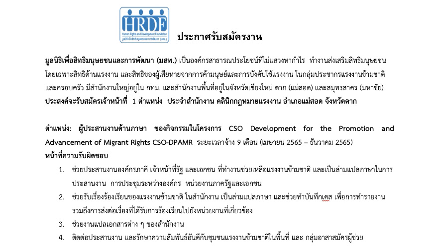 รับสมัคร: ผู้ประสานงานด้านภาษา ของกิจกรรมในโครงการ CSO Development for the Promotion and Advancement of Migrant Rights CSO-DPAMR