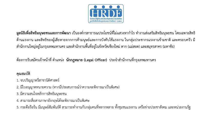 รับสมัคร: นักกฎหมาย (Legal Officer) ประจำสำนักงานที่กรุงเทพมหานคร