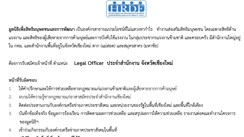 รับสมัคร: Legal Officer ประจำสำนักงาน จังหวัดเชียงใหม่