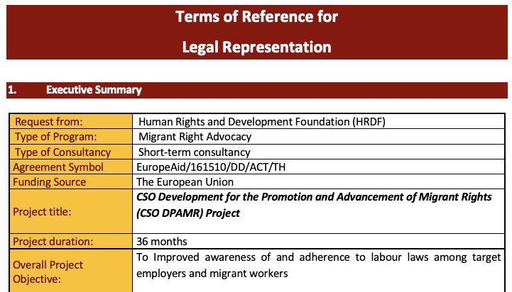 Job Announcement: Lead Consultant to provide legal representation for 4 migrant workersin a court case