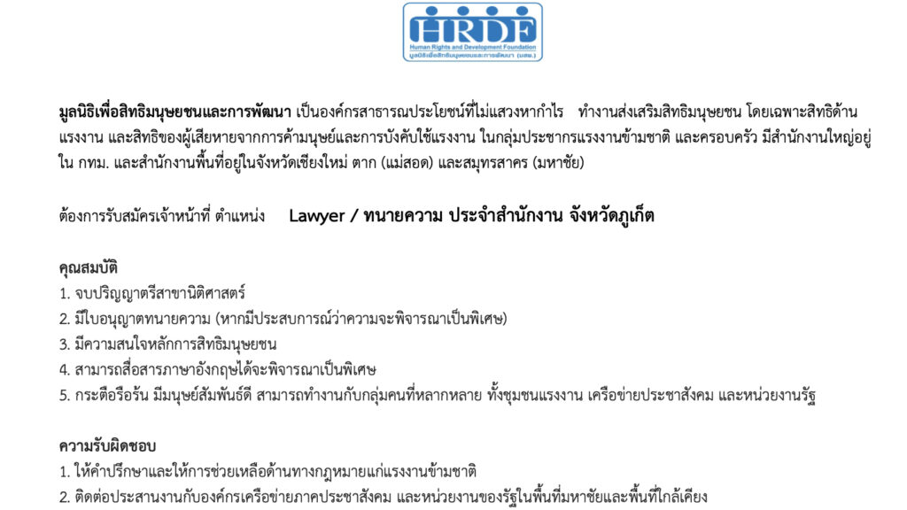 รับสมัคร: Lawyer / ทนายความ ประจำสำนักงาน จังหวัดภูเก็ต