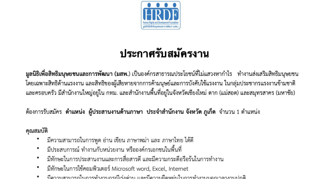 รับสมัคร: ผู้ประสานงานด้านภาษา ประจำสำนักงานจังหวัดภูเก็ต จำนวน 1ตำแหน่ง